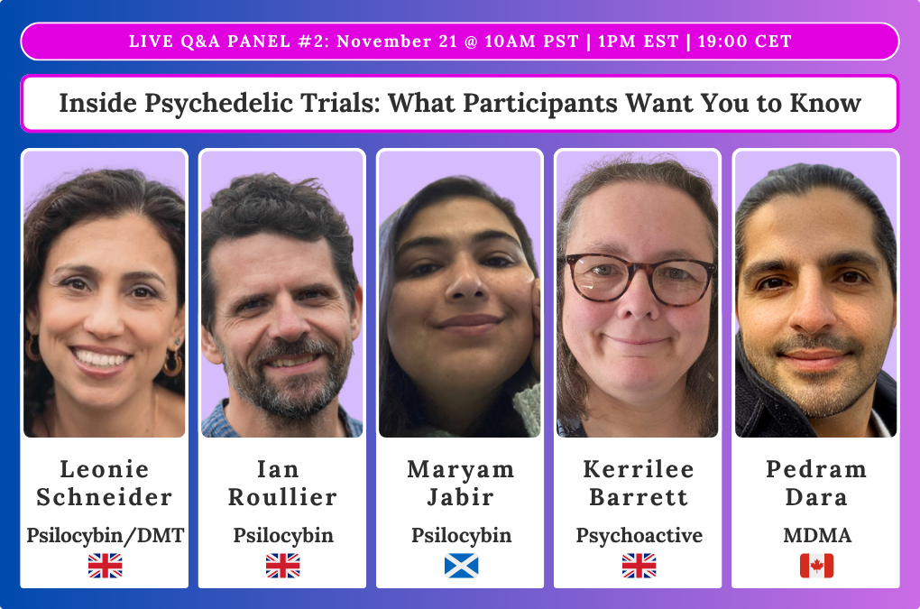 Behind every clinical result is a human story. Leonie Schneider, Ian Roullier, Maryam Jabir, Kerrilee Barrett, and Pedram Dara share firsthand what it’s really like to participate in psychedelic clinical trials using DMT, psilocybin, MDMA, and other psychoactive substances for depression, anxiety, and PTSD. Learn what researchers miss, what participants need, and what it truly feels like to live the science.