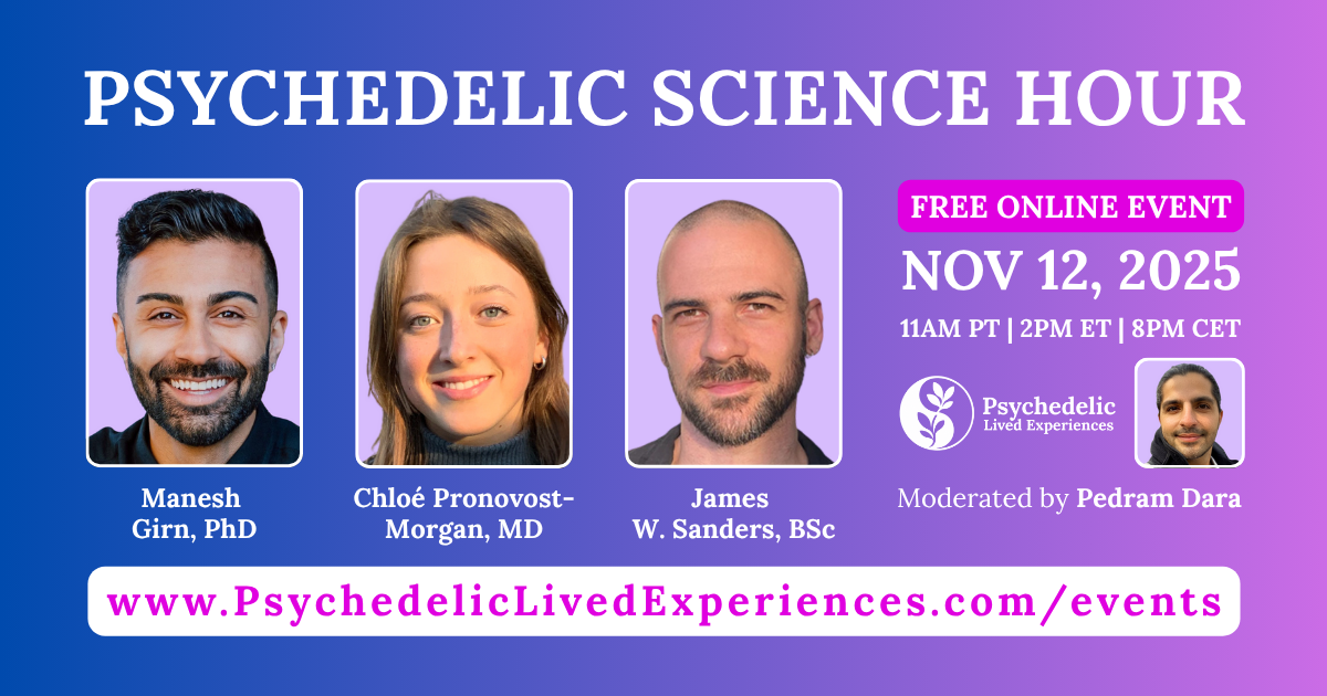 Join Manesh Girn, PhD, Chloé Pronovost-Morgan, MD, and James W. Sanders, BSc exploring the intersection of science and lived experience. Join us live for the premiere of Psychedelic Science Hour.