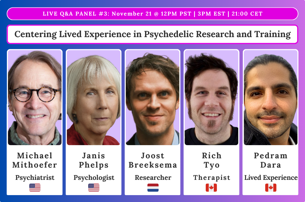 What happens when lived experience becomes evidence? Join Michael Mithoefer, MD, Janis Phelps, PhD, Joost Breeksema, PhD, Rich Tyo, RP, and Pedram Dara as they explore how patient and participant voices can reshape the way we research, train, and deliver psychedelic therapy. This conversation is redefining the future of psychedelic education and care.