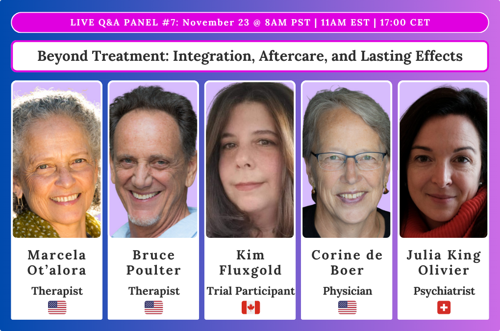 Healing doesn’t end with the session, it begins there. Join Marcela Ot’alora, MFA, Bruce Poulter, RN, MPH, Kim Fluxgold, Julia King Olivier, MD, and Corine de Boer, MD, PhD, to explore the long road of integration and recovery. From unexpected symptoms to the ongoing need for support, this panel exposes where our current systems fall short and how to do better.